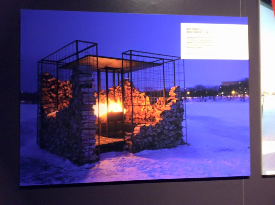 籠状になっている建物に、薪を入れて壁にしている。中央の火鉢に焼べていく。(Winnipeg、カナダ)